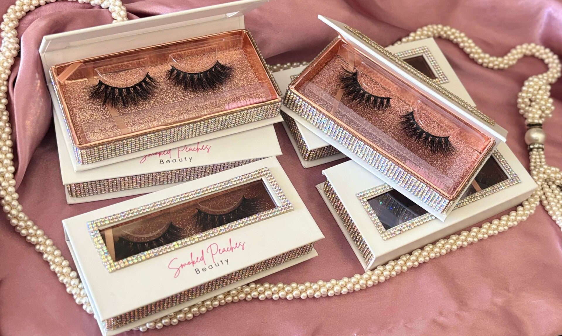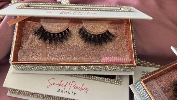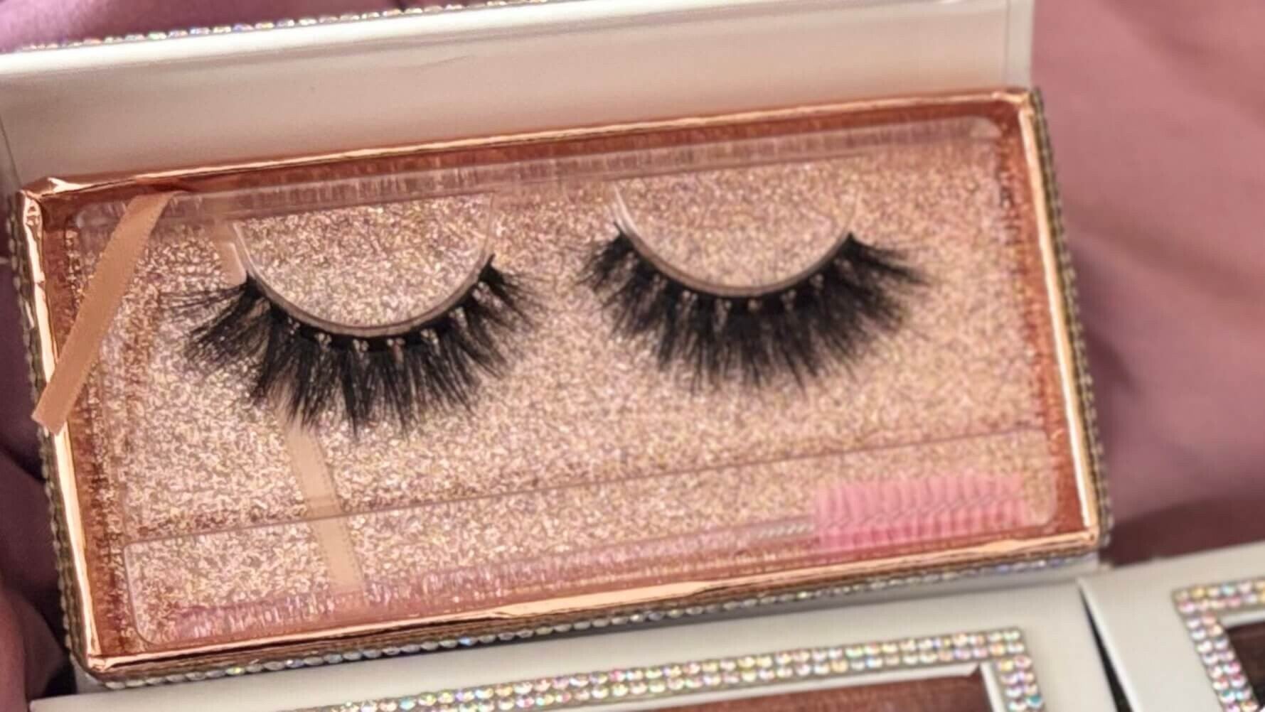 Faux mink 15mm strip eyelashes packaged in a reusable rhinestone magnetic case. With proper care you can get 5-10 wears!